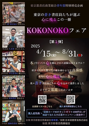 東京都書店商業組合青年部 渾身企画! KOKONOKOフェアのご案内です。東京都書店商業組合加盟店約120店にて4月15日(火)から8月31日(日)まで開催します。我々蒼き書店員たちが本当に心に残った面白い本を紹介します。 紹介者の素性も顔も全部晒します。詳細は全選書リストはこちら、購入者特典と応募方法はこちらをご覧ください |