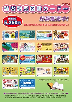 毎年ご好評をいただいている「読者謝恩図書カード」が今年も発行されました 読者謝恩図書カードとはーーー 本は定価で購入するものです。が、実は当組合加盟店では特別価格でご購入いただくことができます。その画期的な方法が「読者謝恩図書カード」です。 この図書カードは額面5250円ですが、協賛出版社様の読書推進へのご協力により特別価格でご購入いただけます。東京都書店商業組合加盟店の読者謝恩図書カード取扱店にて販売しております。加盟していない書店ではお求めいただけませんのでご注意ください。(全国共通図書カードですのでご使用いただくことは可能です) 数に限りがありますのでお求めはお早めに! 詳しくはこちら |
